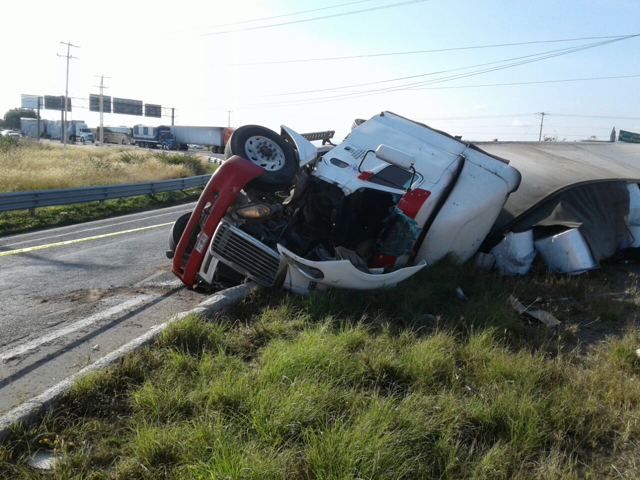El peso ocasionó que el camión volcara sobre su costado izquierdo y la cabina del tractor se comprimió, lo que ocasionó que el chofer quedará atrapado al interior y con el golpe perdió la vida.