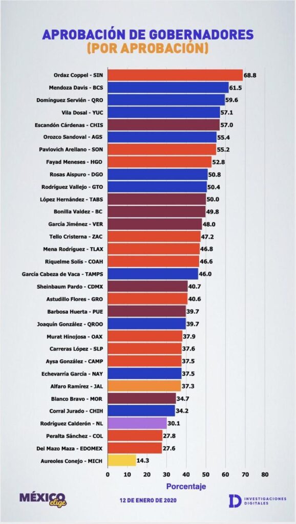 Los tres primero lugares los ocupan Quirino Ordaz de Sinaloa con 68.8% de aprobación, Carlos Mendoza de Baja California con 61.5% y Francisco Domínguez Servién, gobernador de Querétaro, con 59.6% de aprobación por parte de sus gobernados.