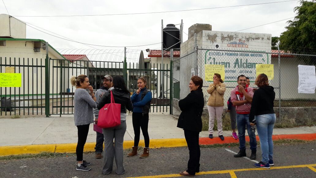 Santiago de Querétaro, Qro.- Los padres de familia de la escuela primaria Juan Aldama, en la colonia Los Sauces, se manifestaron al exterior de las instalaciones solicitando el cambio de directora, quien a su decir, genera conflictos entre los maestros y lleva una investigación por maltrato a menores de otra institución.
