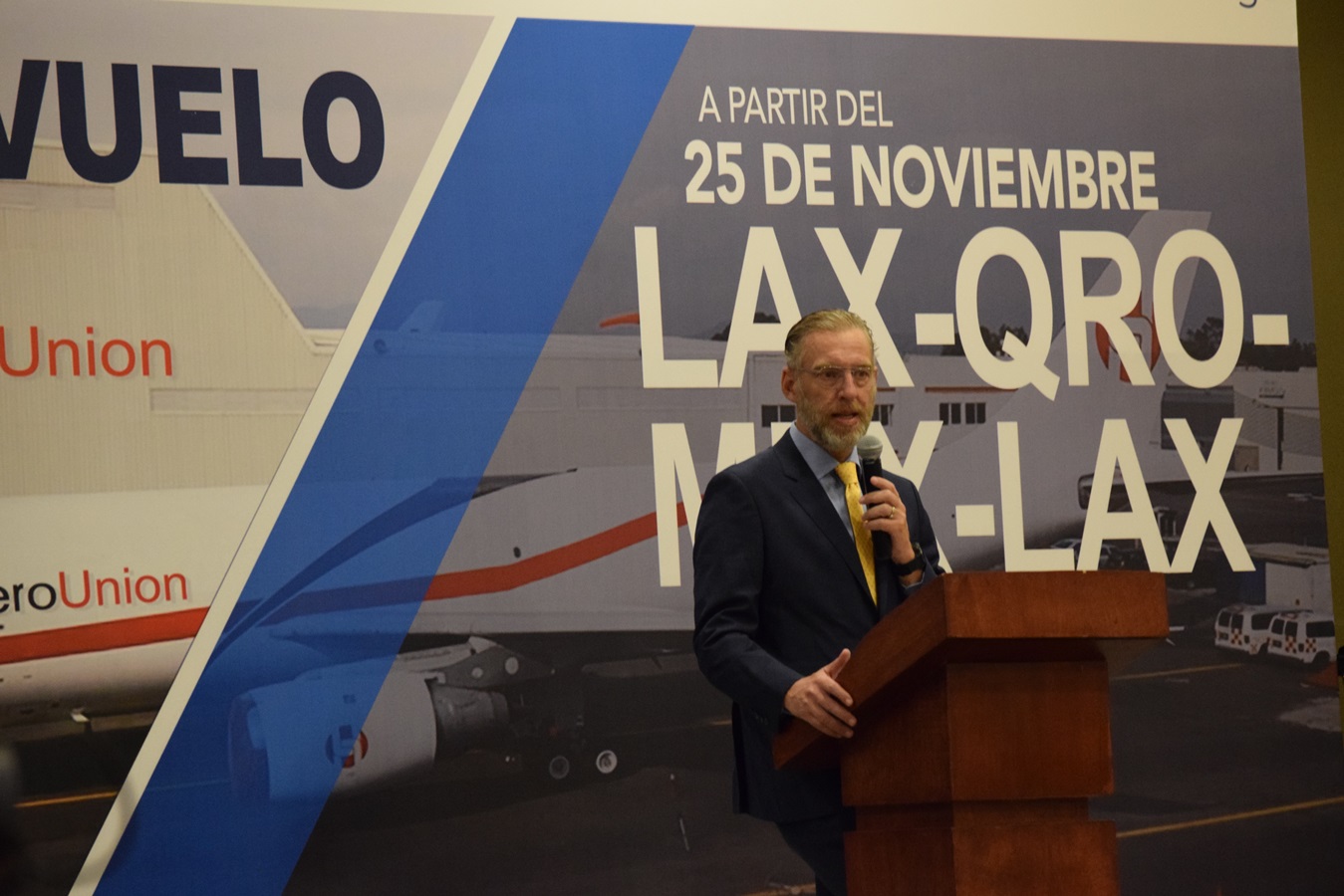 Querétaro, 20 de noviembre.- El titular de la Secretaría de Desarrollo Sustentable (SEDESU), Marco Antonio Del Prete Tercero, anunció que a partir del 25 de noviembre en la terminal de carga del Aeropuerto Intercontinental de Querétaro (AIQ) se inician operaciones del vuelo de carga Los Ángeles-Querétaro, con la compañía Aerounión.