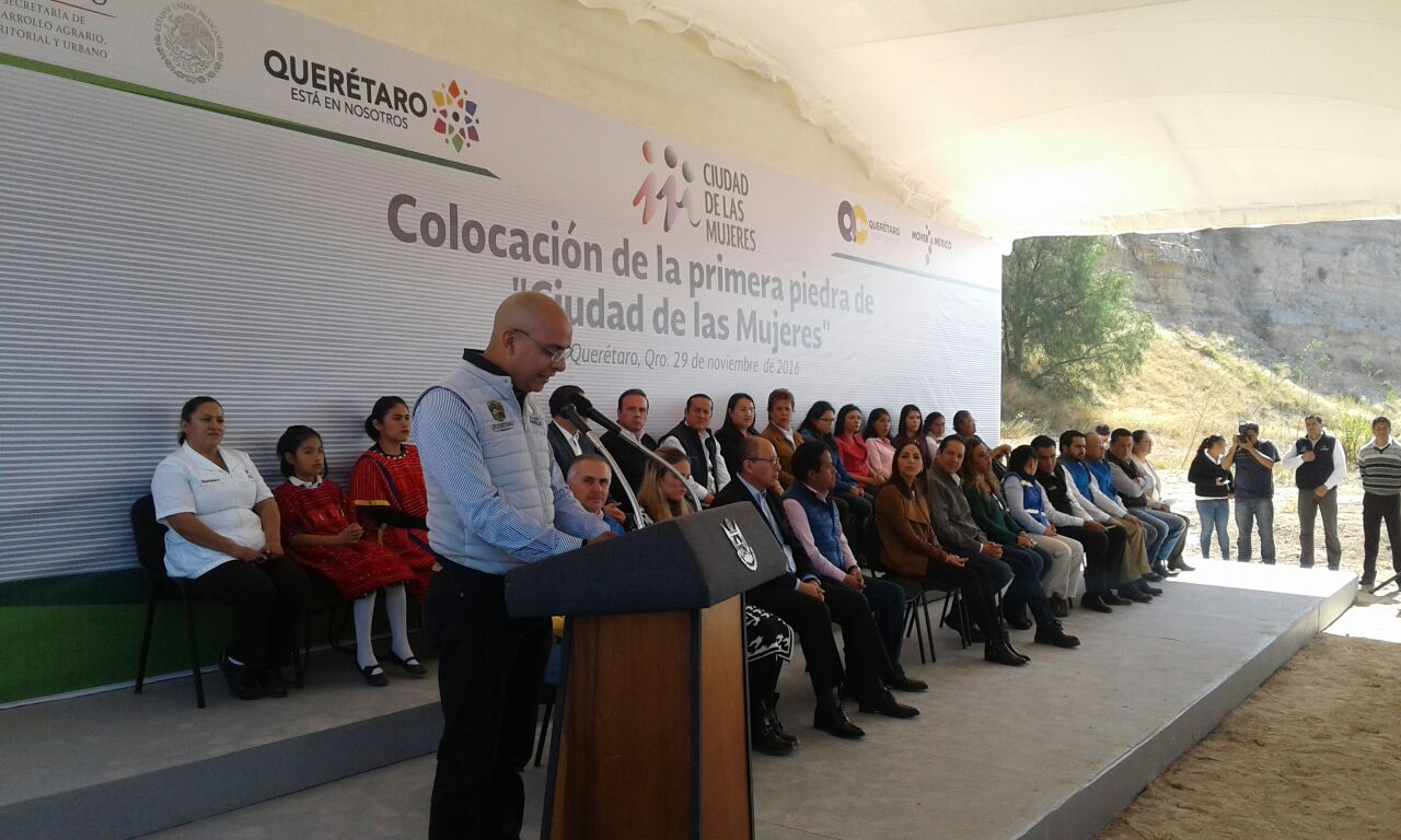 Querétaro, 29 de noviembre.- Fue colocada la primera piedra de lo que se espera que dentro de unos meses se convierta en la ciudad de las mujeres, un proyecto que impulsa el Gobierno Federal, en conjunto con el estado y el municipio de Querétaro.