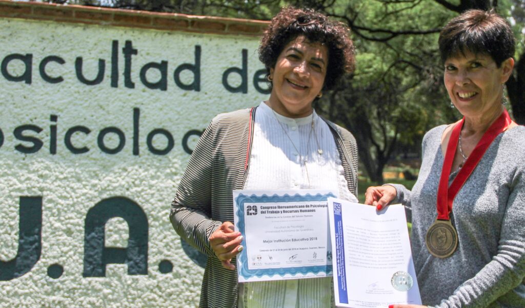 Querétaro, 29 de julio.- En el marco del 30° aniversario de la Maestría en Psicología del Trabajo que oferta la Facultad de Psicología de la Universidad Autónoma de Querétaro (UAQ), esta unidad académica recibió el premio a la Mejor Institución Educativa, dentro del Congreso Iberoamericano de Psicología del Trabajo y Recursos Humanos 2018 que se celebró en Acapulco, Guerrero.