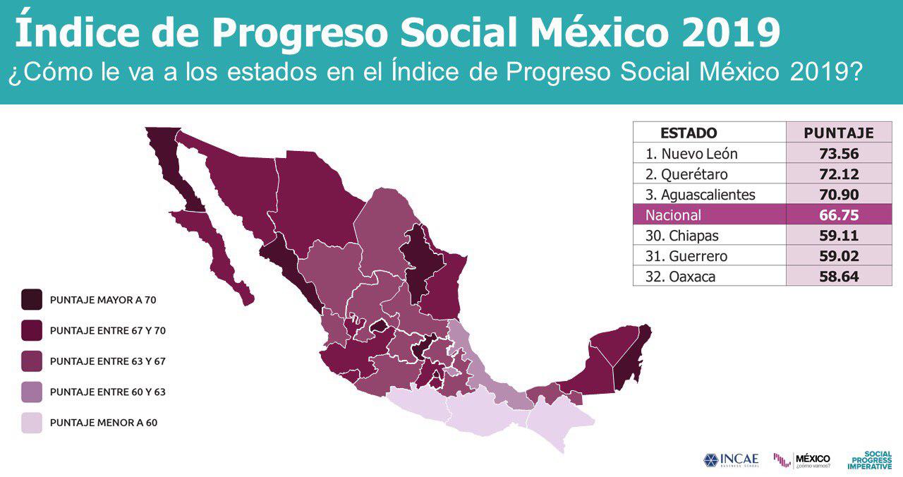 En contraste, los tres con menor puntaje en el índice son Chiapas (59.11/100), Guerrero (59.02/100) y Oaxaca (58.64/100). La organización Social Progress Imperative creó el Índice de Progreso Social con el fin de medir el desarrollo social de los países