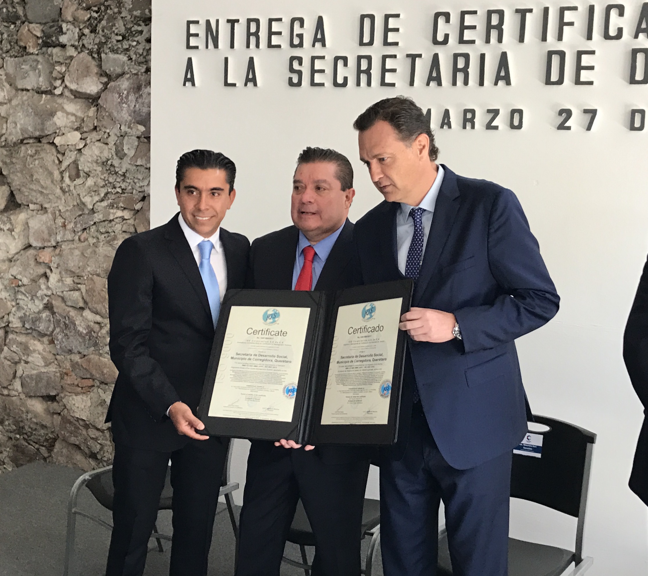 Querétaro, 27 de marzo.- La Secretaría de Desarrollo Social del Municipio de Corregidora recibió el certificado ISO 9001 – 2015, que otorga la consultora privada IQS Corporation por las buenas prácticas y atención a los ciudadanos.