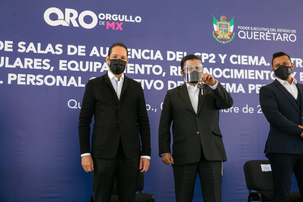 Expresó que a partir de ello se construyeron las salas de audiencia en el Centro Penitenciario Femenil (CP2) y en el Centro de Internamiento y Ejecución de Medidas para Adolescentes (CIEMA), donde se efectúan procesos penales y orales más seguros y eficientes; asimismo, con una inversión de 40.4 millones de pesos de recursos estatales hoy se incorporan nuevas unidades vehiculares y equipo de radiocomunicación para fortalecer sus labores de seguridad y vigilancia.