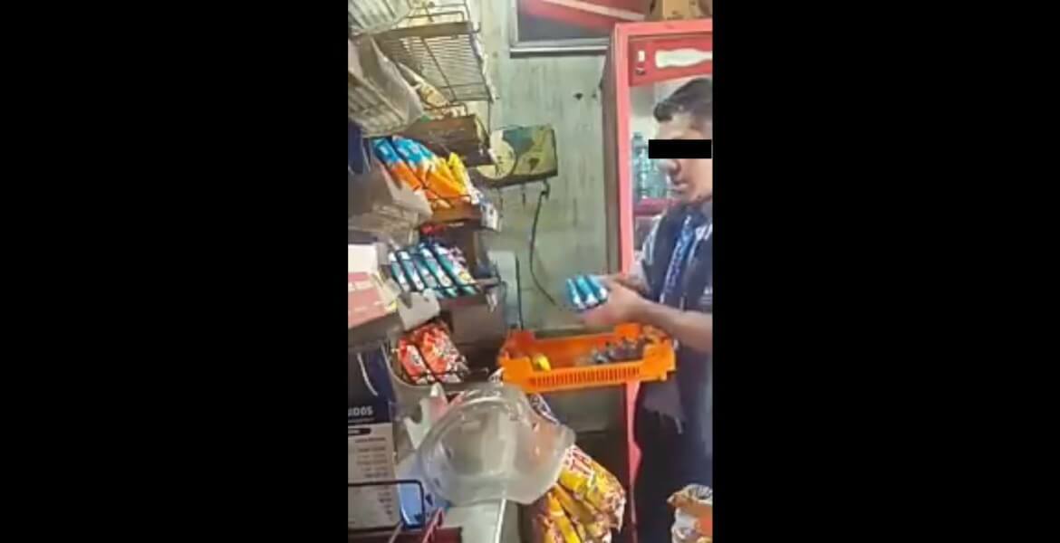 En el video se puede observar que mientras el distribuidor está colocando los productos en los estantes de la tienda, toma algunos y los mete rápidamente en su chaleco.