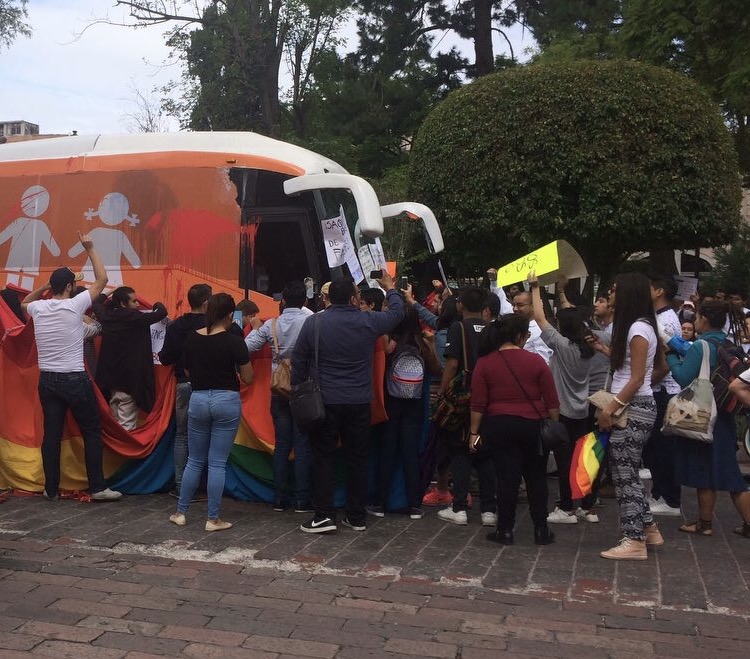 Querétaro, 8 de julio.- Decenas de personas de la comunidad LGBT rechazaron el paso por Querétaro del «Autobús de la Libertad», con el que miembros del Consejo Mexicano de la Familia rechazan la “ideología de género”.