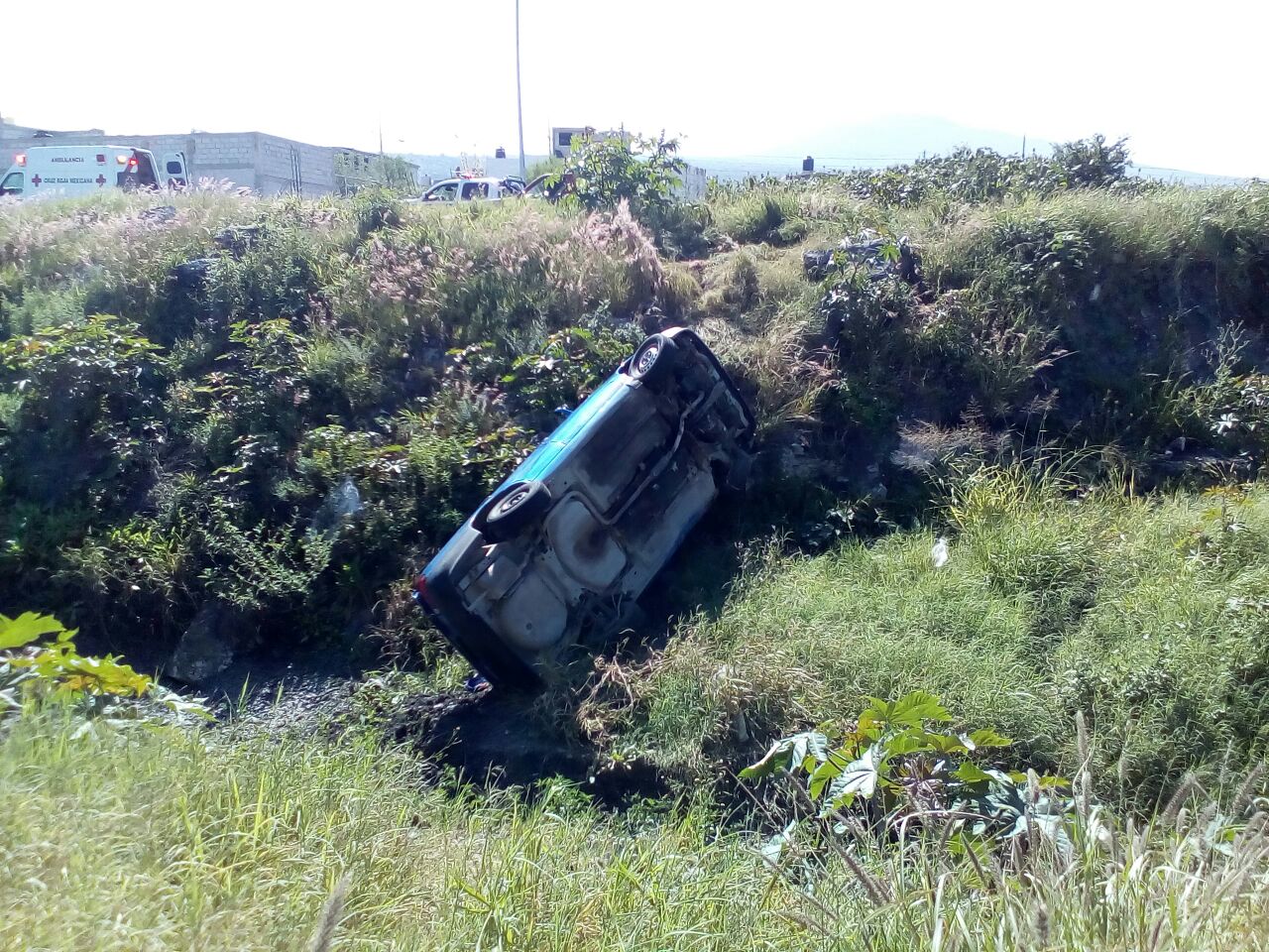 El auto compacto color azul terminó dentro del tren pluvial, pero afortunadamente sus ocupantes llevaban puesto el cinturón de seguridad por lo que no presentaron ningún daño, elementos de la Policía Municipal de Querétaro llegaron al lugar para atender el percance.