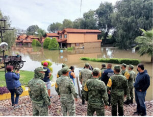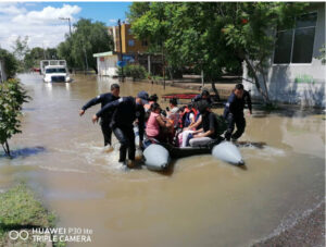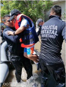 Elementos de Policía Estatal (PoEs) en coordinación con elementos del Ejército Mexicano, de la Guardia Nacional, de las corporaciones policiales municipales, de las corporaciones estatales y municipales de Protección Civil, así como corporaciones de Bomberos, apoyan a los habitantes de las zonas afectadas por las lluvias en los municipios de San Juan del Río y Tequisquiapan. En la comunidad de La Rueda, San Juan del Río, las distintas corporaciones de los tres ordenes de gobierno evacuaron a decenas de personas que se encuentran en zonas afectadas por inundaciones, incluso con el uso de lancha.