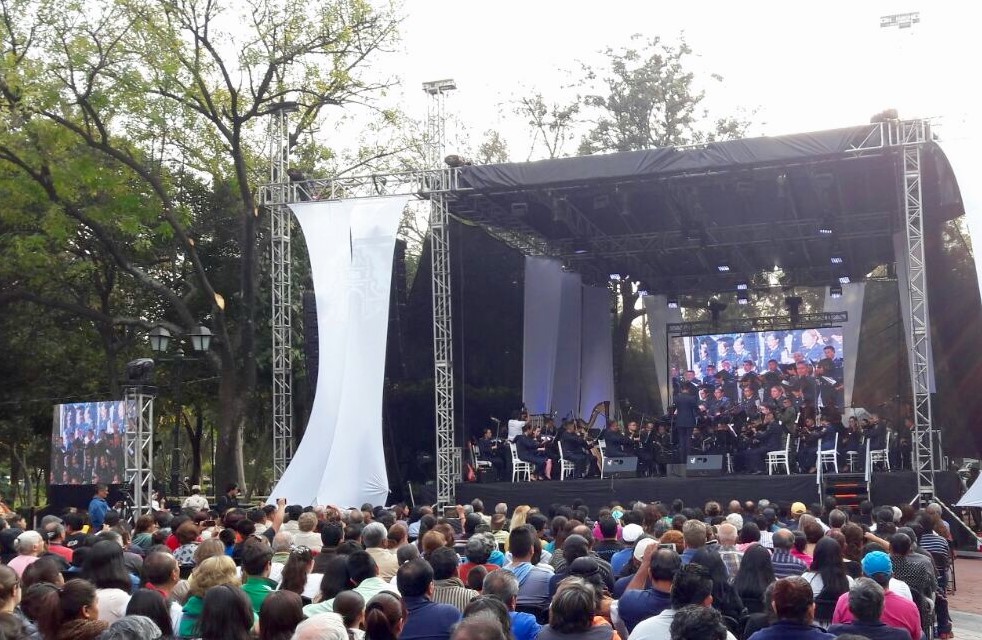Querétaro, 4 de febrero.- Como parte de los festejos por el Centenario de la promulgación de la Constitución mexicana, la Orquesta Sinfónica de la Secretaría de la Defensa Nacional con coros y mariachi, se presentó en las instalaciones de la Alameda Hidalgo con una afluencia de más de mil personas.