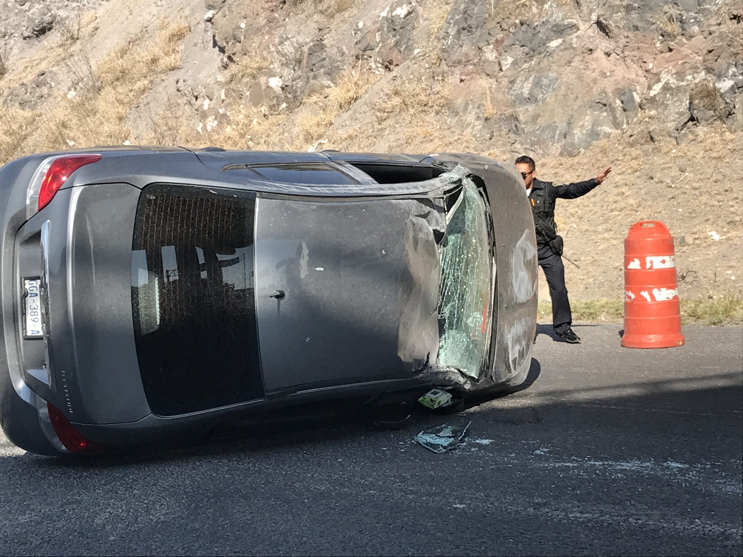 Querétaro, 12 de abril.- Aparatosa volcadura que dejó cuantiosos daños materiales se registró en la carretera México – Querétaro, en la franja de incorporación al boulevard Bernardo Quintana.