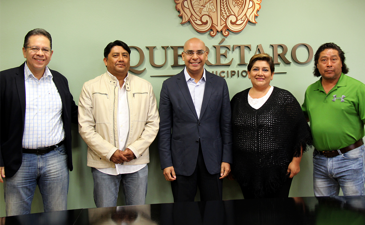 Querétaro, 16 de julio.- El presidente municipal de Querétaro, Marcos Aguilar Vega, en compañía del secretario general de Gobierno, Agustín Luna Lugo, se reunió en las instalaciones de Centro Cívico con Rocío Alvarado, Sergio Razo y Jorge Luis Ruiz, representantes del gremio de comerciantes en vía pública.