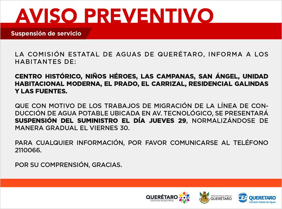 Querétaro, 28 de diciembre.- A través de un comunicado, la Comisión Estatal de Aguas (CEA) informó con la finalidad de prevenir incidencias futuras que afecten el sistema de distribución de agua potable de la Zona Centro de la ciudad, la CEA y la Secretaría de Desarrollo Urbano y Obras Públicas (SDUOP), llevarán a cabo la sustitución de la tubería que conforma la línea de conducción localizada en la Av. Tecnológico, en sus intersecciones con Universidad, Mariano Escobedo, Hidalgo y Avenida del 57.