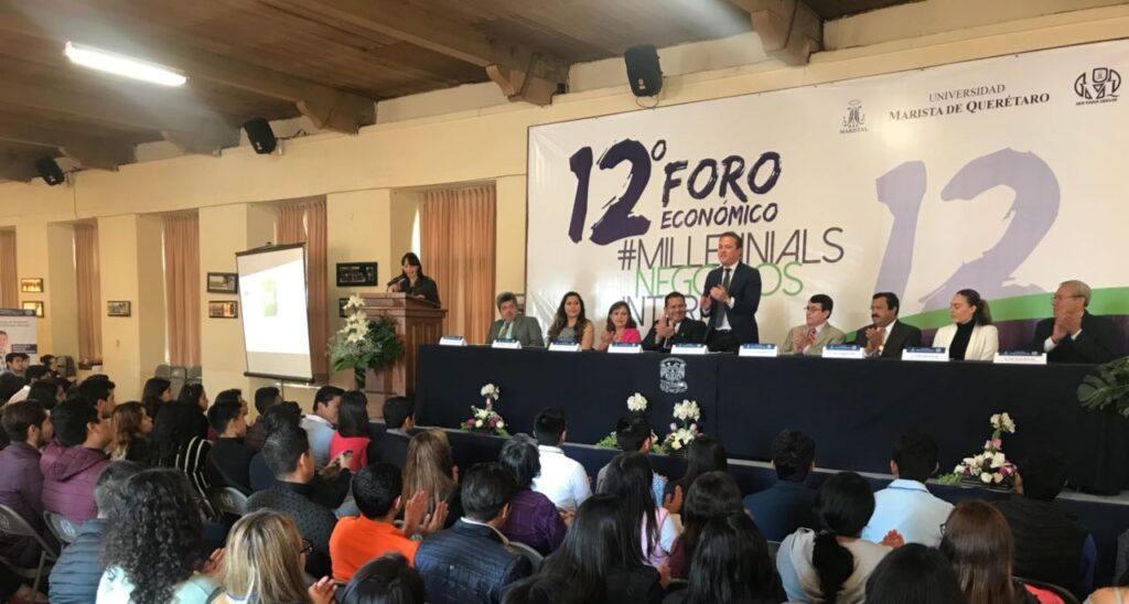 Querétaro, 8 de marzo.- El secretario de la Juventud (SEJUVE), Rodrigo Ruiz Ballesteros inauguró el “12 Foro Económico Millennials, Negocios e Internet”, organizado por los alumnos de Octavo Semestre de la Licenciatura en Economía y Finanzas Internacionales de la Facultad de Ciencias Administrativas de la Universidad Marista de Querétaro.