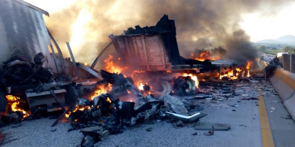 19 octubre.- Un tráiler se accidentó en el kilómetro 165 de la autopista México-Querétaro, derribó el muro de contención y estalló en llamas en el camellón central de la carretera 57, a la altura de la comunidad de Loma Linda, en San Juan del Río QRO.