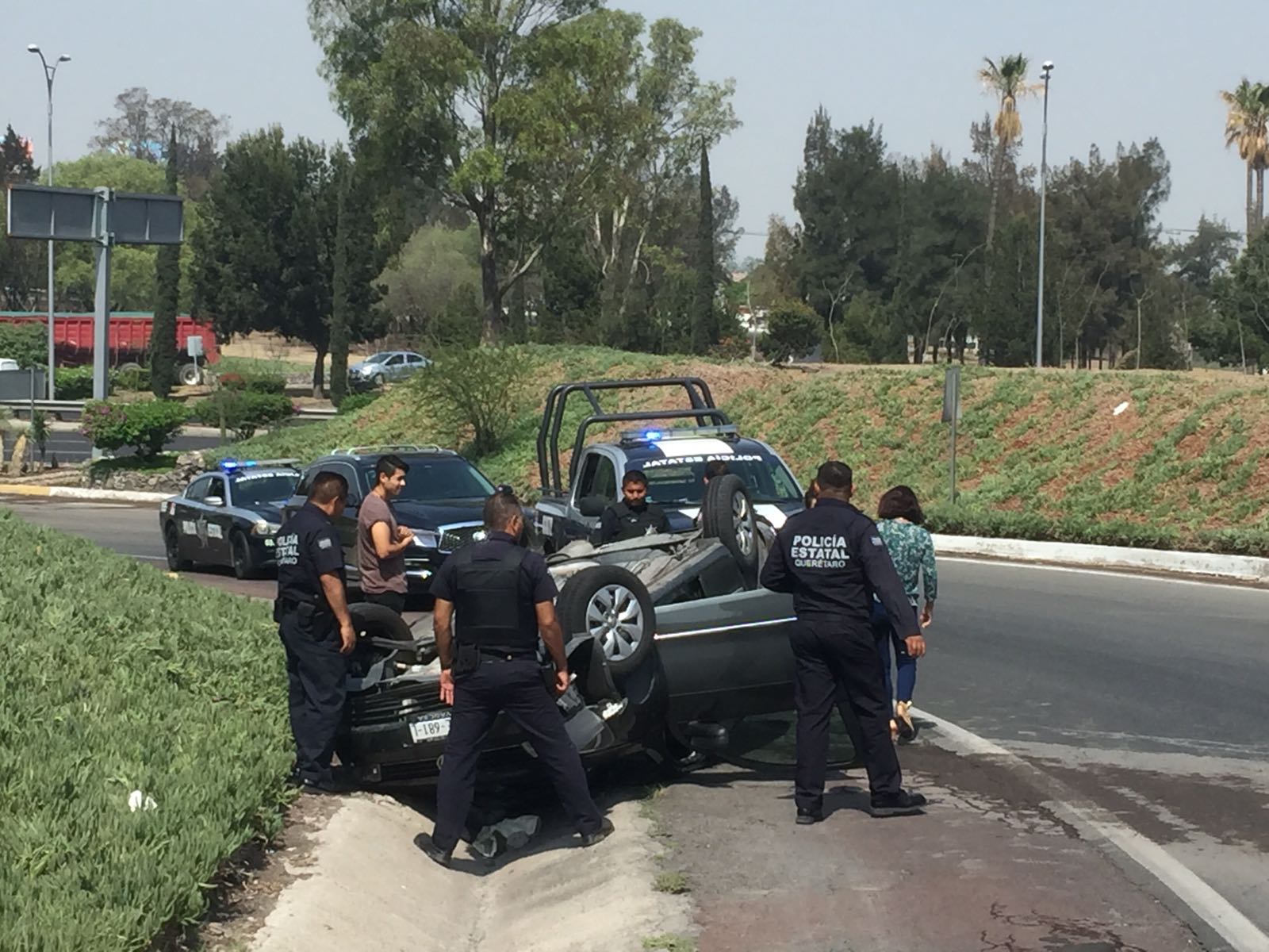 Querétaro, 23 de mayo.- Un auto tipo sedán terminó volcado en la incorporación de la carretera México – Querétaro con Boulevard Bernardo Quintana, la conductora perdió el control y cayó al canal pluvial.