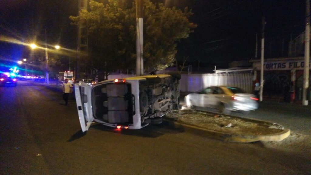 Querétaro, 3o de diciembre.- Una camioneta van terminó volcada después de ser embestida por un auto Sedán en el cruce de Avenida Felipe Carrillo Puerto y Avenida Revolución, en el percance no hubo personas lesionadas.