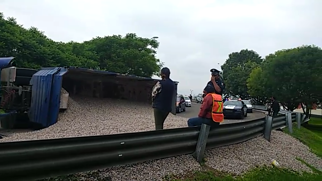 Querétaro, 18 de julio.- Un tráiler cargado con al menos 6 toneladas de grava terminó volcando en la curva de incorporación de la carretera México – Querétaro, en Avenida Constituyentes, el conductor aseguró que el pesado camión comenzó a recostarse por el peso y la curva.