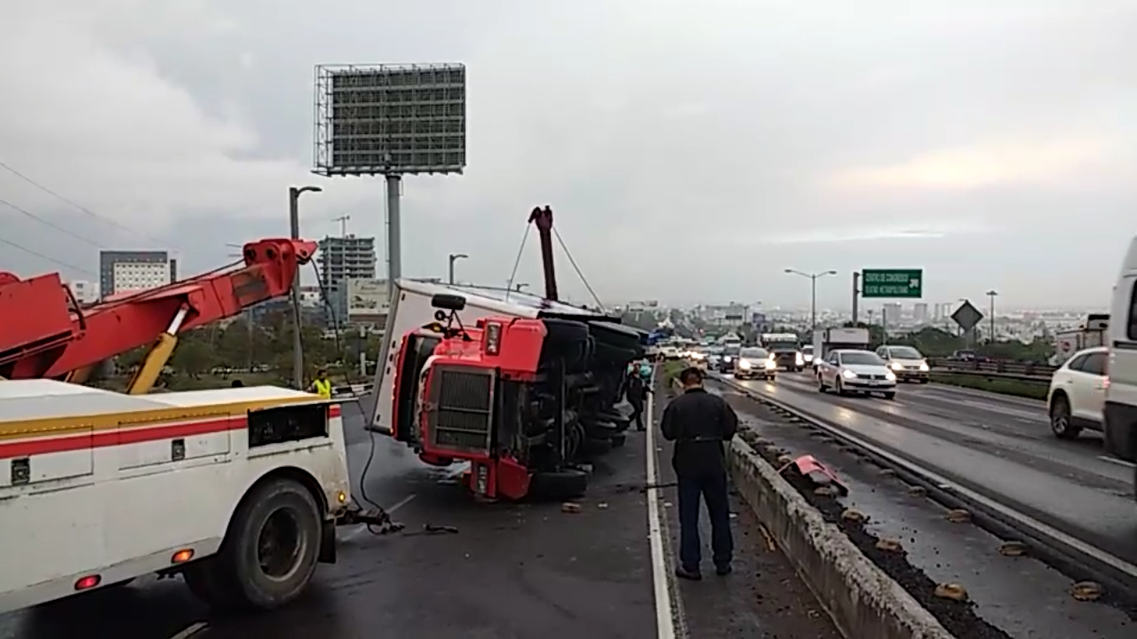 Querétaro, 12 de julio.- Un tráiler perdió el control al salir del camino en la carretera México – Querétaro y terminó volcado justo frente al puente de la Fiscalía General del Estado.