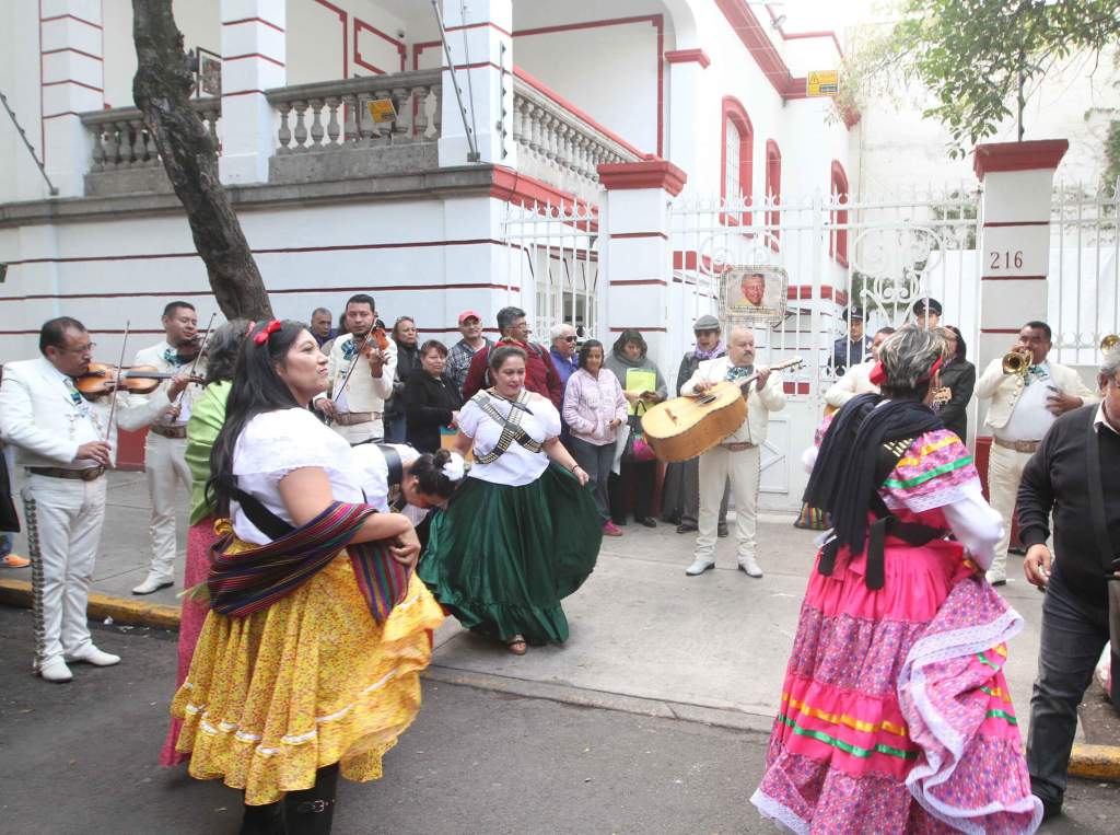 Además del mariachi, un grupo de mujeres vestidas de Adelitas entonan diversas melodías, a pesar de que el presidente electo no está en ese inmueble.
