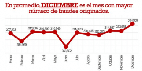 En los últimos siete años, diciembre registró un promedio de 334 mil 609 reclamaciones por posible fraude de mexicanos, 6.5 por ciento más que el promedio de noviembre (el segundo mes con más reclamaciones) y 25.5 por ciento que junio, el mes con el menor número de quejas.