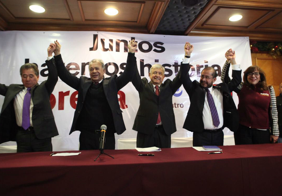 Querétaro, 13 de diciembre.- Con el objetivo de impulsar la candidatura de Andrés Manuel López Obrador a la Presidencia de la República en 2018, El partido Encuentro Social (PES), Morena y el Partido del Trabajo (PT) dieron a conocer la coalición «Juntos haremos historia».