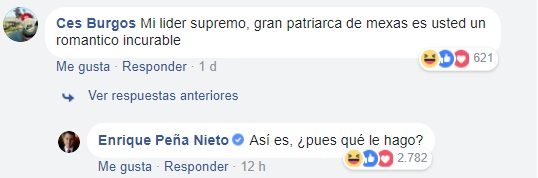 Por su parte, el usuario Sarinel Villegas comentó también la publicación que Peña dedicara a Ángelica Rivera con motivo de San Valentí: «Es usted un poeta, grandísimo tlatoani! Ni el magnífico Nezahualcóyotl tejía versos como usted», se lee. A este comentario, el mandatario mexicano señaló: “Estoy enamorado”.