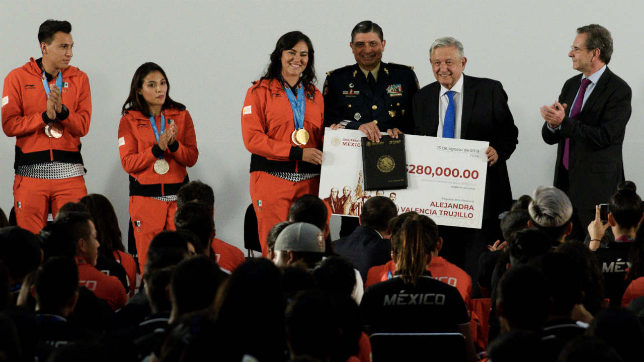 El presidente de la República, Andrés Manuel López Obrador, hizo entrega de los incentivos económicos que prometió a los atletas que participaron en los Juegos Panamericanos de Lima 2019, acompañado de Ana Gabriela Guevara, titular de la Conade.