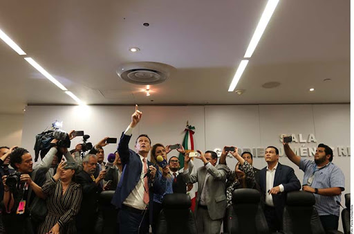 Mientras Mauricio Kuri del PAN mostraba los micrófonos, Juan Zepeda, de Movimiento Ciudadano, le ayudaba a sostener los cables y mostrarlos ante la prensa.