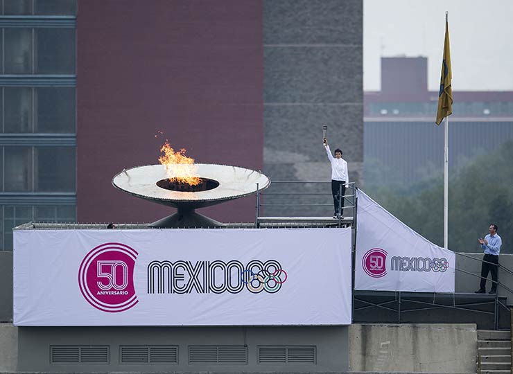 12 octubre.- El Pebetero Olímpico en el Estadio Olímpico de Ciudad Universitaria fue encendido nuevamente por Enriqueta Basilio a las 12:50 horas, tal como ocurrió hace 50 años en los Juegos Olímpicos de 1968.