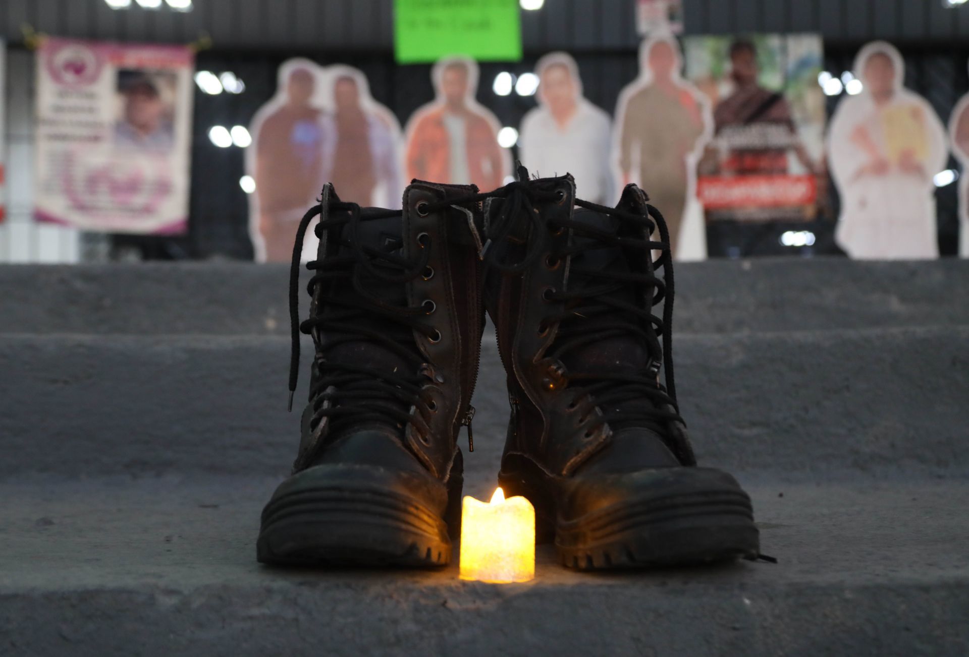 TUXTLA GUTIÉRREZ,CHIAPAS, 15MARZO2025.- Frente al Palacio de Gobierno en Tuxtla Gutiérrez, la colectiva "Madres en Resistencia" colocó un altar en honor a las víctimas de Teuchitlán, Jalisco. Algunos zapatos, veladoras, un moño negro y fotos en tamaño real fueron parte de los elementos que componían este altar. FOTO: ESPECIAL/CUARTOSCURO.COM